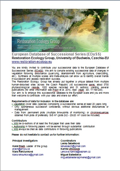 You are kindly invited to contribute your successional data to the European Database of Successional Series (EDaSS). We aim to compile existing successional data of changes in vegetation following disturbance and thus enlarge an existing unique dataset from multiple human-disturbed sites across the Czech Republic (see here) to the European scale. You are more than welcome to contribute with your data and share our effort! See our flyer for more information.