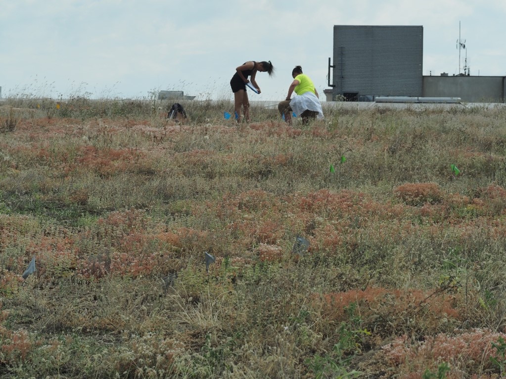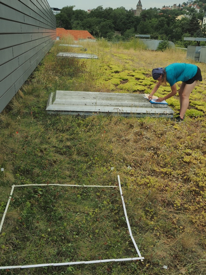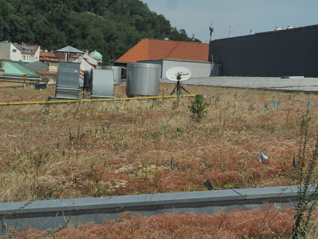 On July 3rd, we monitored an experimental plot on the roof of the Nový Smíchov shopping mall, where we are observing the effect of various treatments, and sowing of several plant species. June was extremely dry and hot, which affected the entire vegetation on the roof. Most of the plants were damaged by water stress. The exception was stonecrops (i.e. plants from the Sedum genus). They are leaf suculents that, due to their special metabolism, tolerate drought very well and were flowering at the time of our monitoring. Plants from sowings thrived better in places where conditions were slightly more favourable, for example, at least partially shaded or more humid. We will continue in our observations.