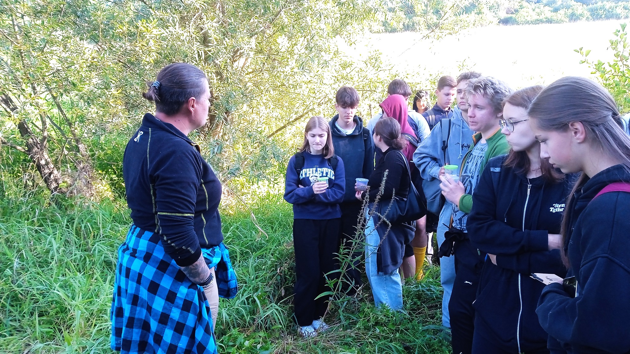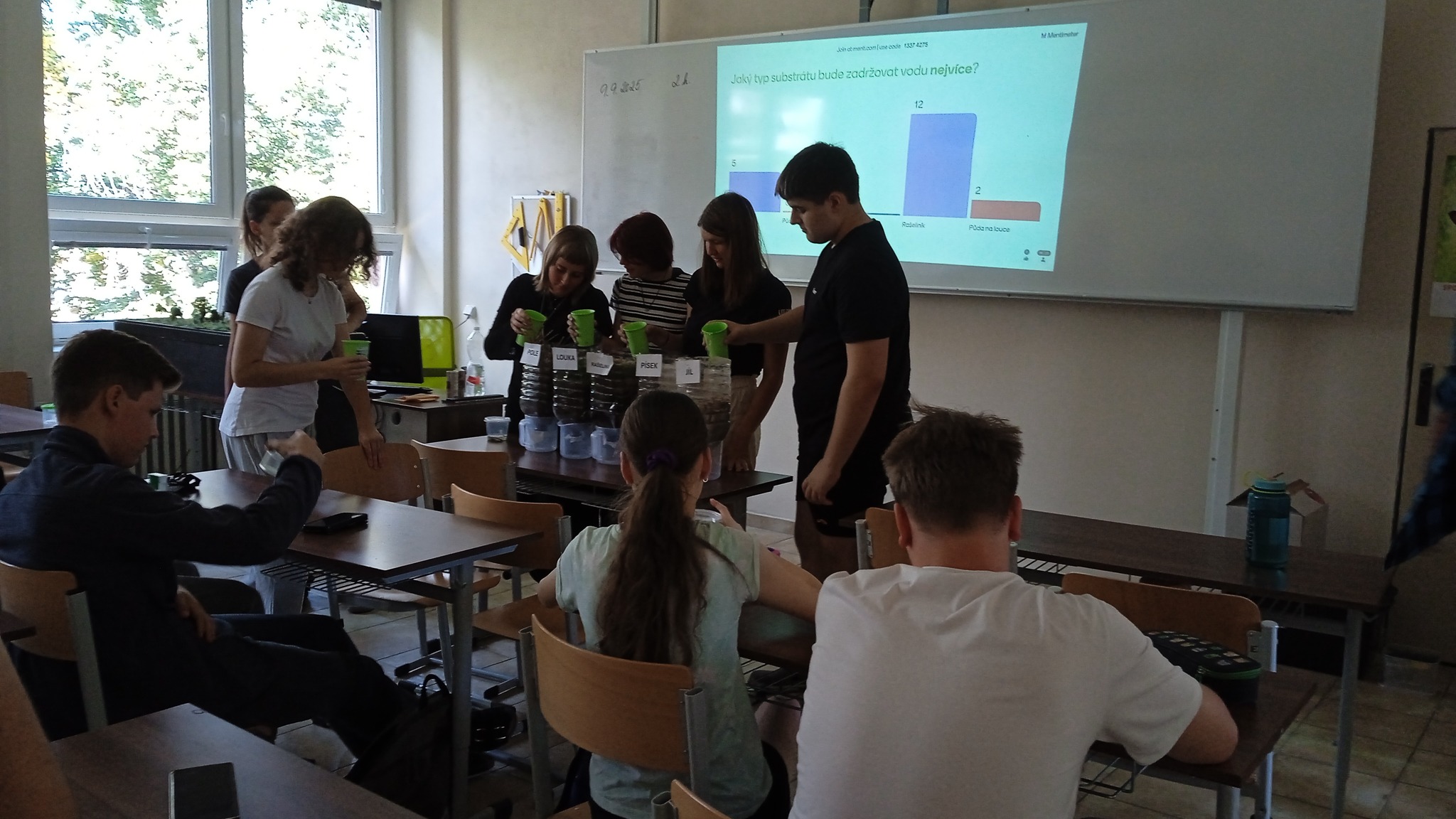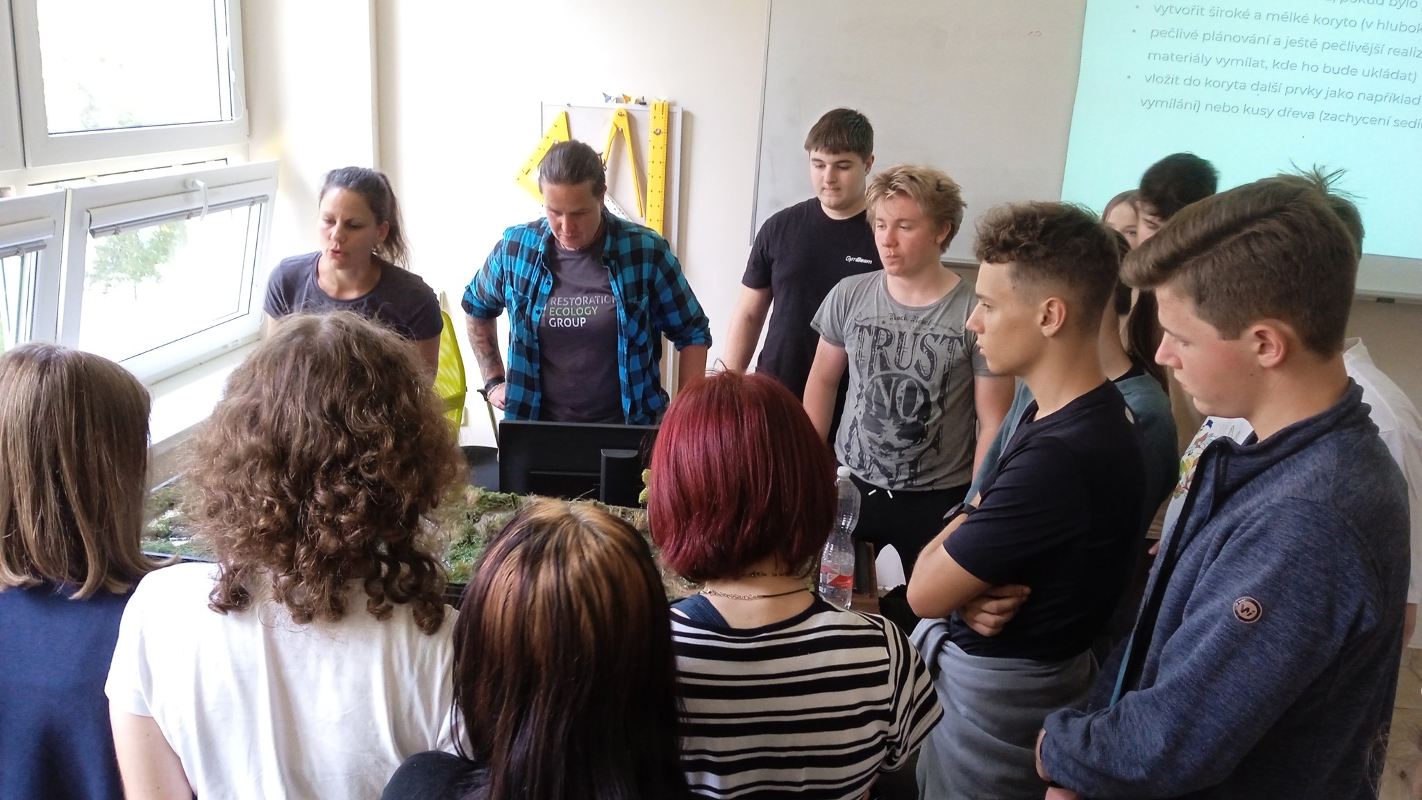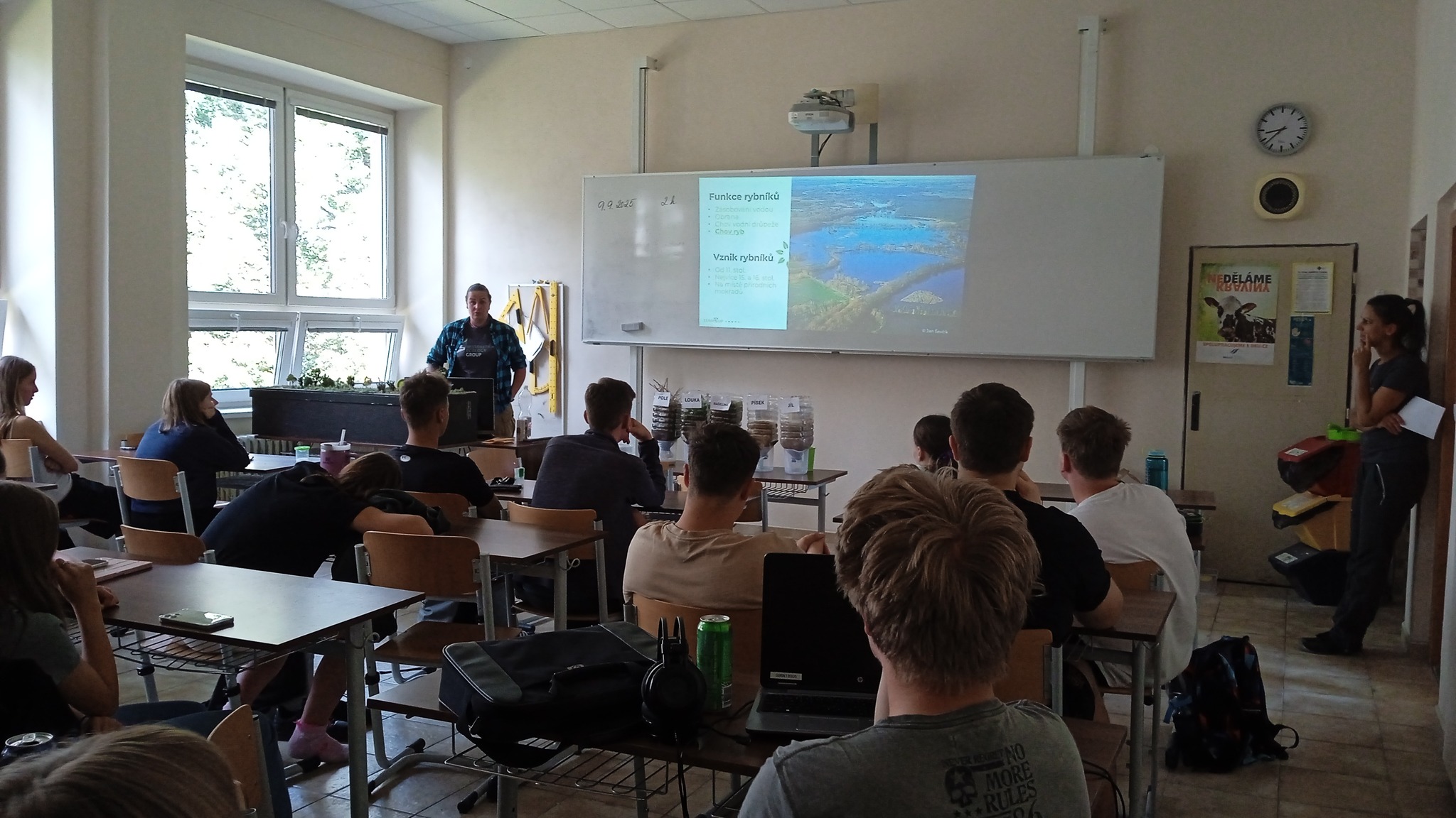 The new school year has just begun, and we have already completed intensive field training with students from the Agricultural College and Agricultural Secondary School Benešov on the topic of water retention in the landscape and the revitalization of watercourses. We spent the morning visiting two examples of revitalization that took place at different locations along the Benešov brook. The students had the opportunity to see the revitalized stream bed and several newly created pools, where we showed them how revitalization contributes to slowing down water runoff from the landscape, but also what to avoid in order to ensure successful restoration. Students also caught aquatic orgamisms. Among the finds were mayfly larvae, but also the predatory water scorpion Nepa cinerea. In the afternoon, we summarized our field findings in a comprehensive lecture on the importance of water in the landscape. We also gave examples of aquatic and wetland ecosystems in our landscape, the problems they currently face, and the possibilities for their revitalization. With the help of samples of several types of substrate, the students were able to test how well different substrate types are able to retain water. Students could verify their assumptions, and see how soil quality affects, for example, the risk of flooding. Using a model of a riverine landscape, we showed how a watercourse in a natural riverbed functions as protection against the formation of a rapid flood wave.