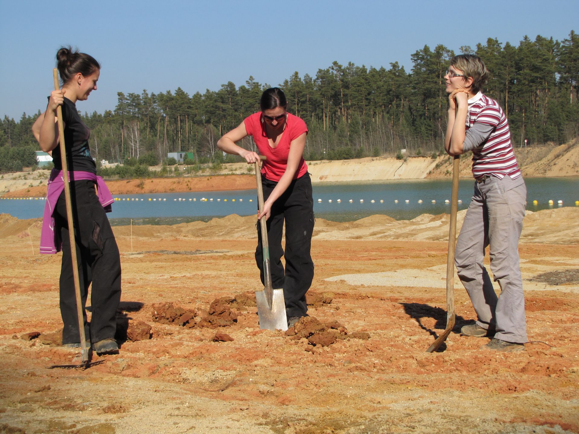 The research activity on experimental plots in the Cep II sand pit has many aspects. Our team may have been confused with a cheerful bunch of excavation diggers theese days. Minor landslide of a slope above our experimental "chessboard" overlaid one of the plots and silted the drainage channel. It was therefore necessary to take up shovels. In addtion some of the experimental plots were disrupted by creation of small holes for seedlings establishment. In this case spades and rakes were the best working tools. However, not everybody participated equally in the excavation works as you can see in the pictures :).