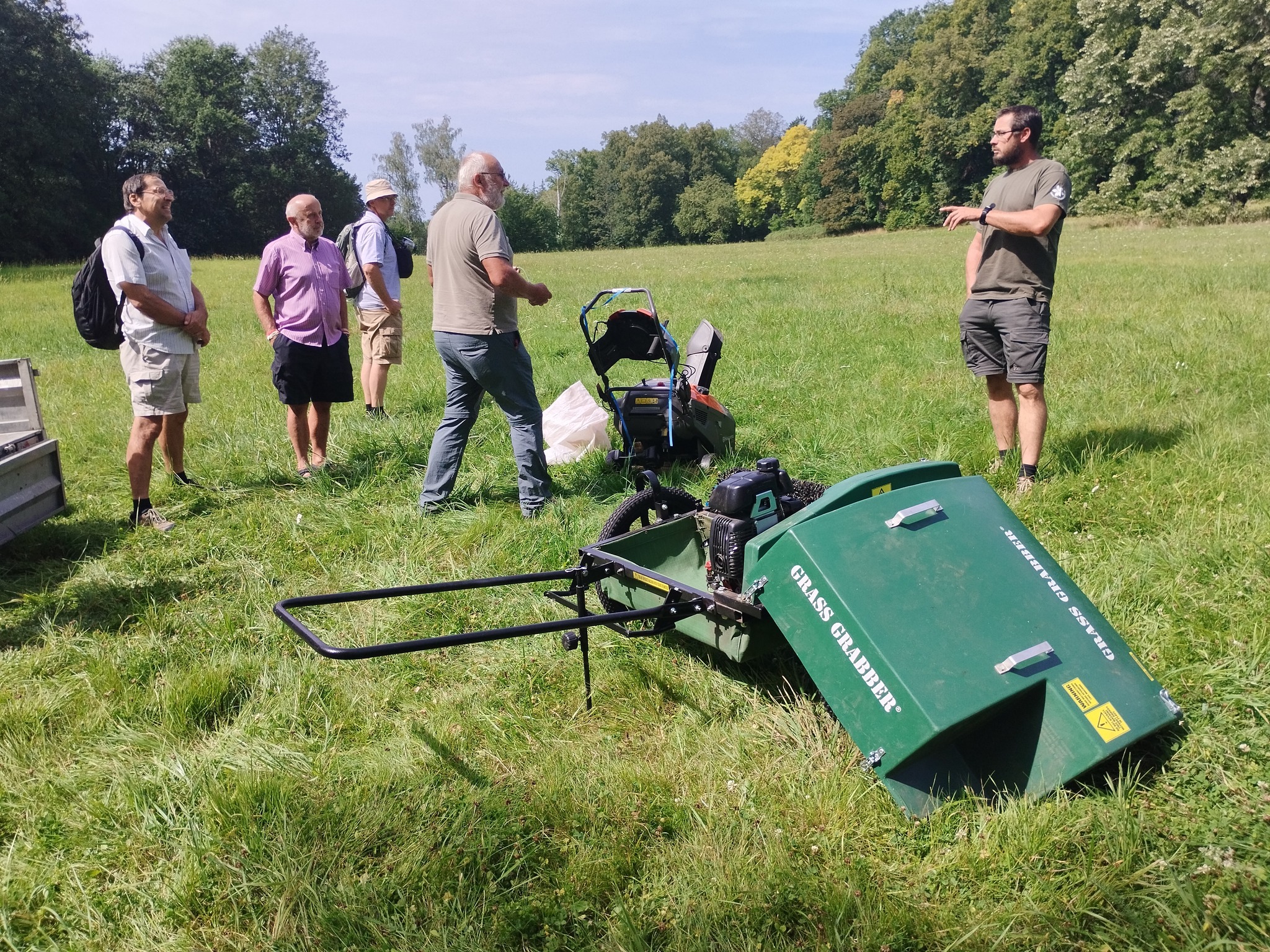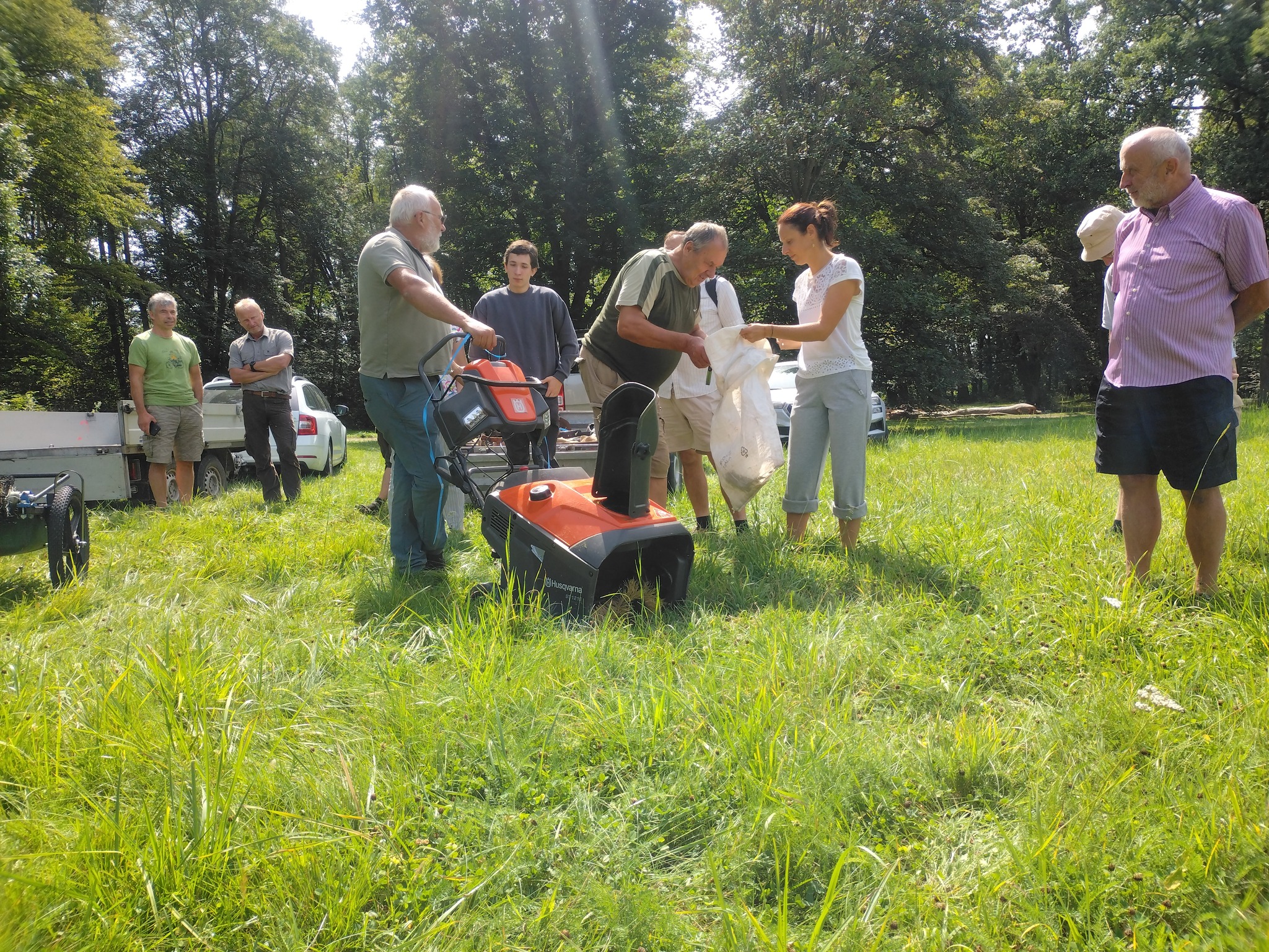 In the afternoon part of the workshop, we moved to the Konopiště Castle Park, where species-rich stands suitable for seed brushing were selected. There were four machines presented for seed harvesting: hand-guided Grass Graber and a hand-held harvester, both operated by the Czech Union for Nature Conservation Šumava, hand-guided Seed Monster from Prague, and a snow blower converted into a brush harvester.