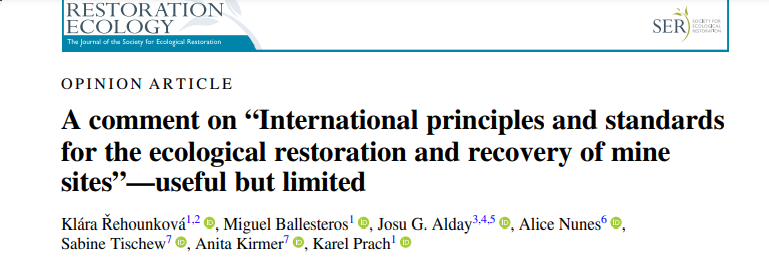 Řehounková, K., Ballesteros, M., Alday, J.G., Nunes, A., Tischew, S., Kirmer, A. and Prach, K. (2023), A comment on “International principles and standards for the ecological restoration and recovery of mine sites”—useful but limited. Restor Ecol e13872. https://doi.org/10.1111/rec.13872