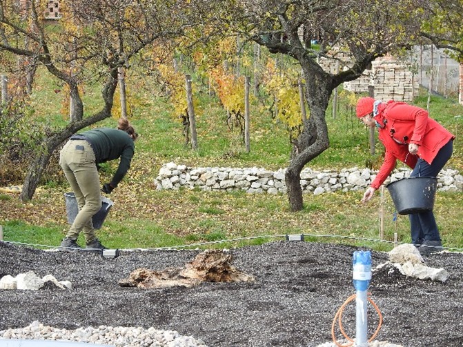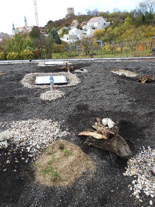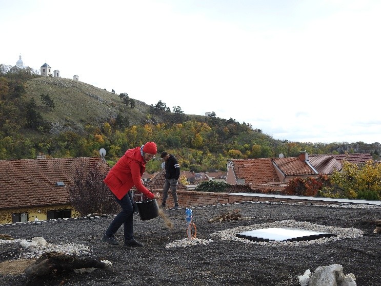 A new biodiverse green roof is being created near Kozí hrádek in Mikulov – and we were there to assist its creation. The roof was seeded with a seed mixture brushed from Stolová hora and Dunajovické kopce in Pálava, enriched with hand-collected seeds of regional origin. The aim is to create a steppe-like community similar to those that occur naturally in the surrounding area. The character of the roof is complemented by small limestone rocks and dead wood, which will provide shelter for various invertebrate species. The project is being implemented by GreenVille, with whom we are collaborating on a TAČR project aimed at supporting the biodiversity on urban green roofs.